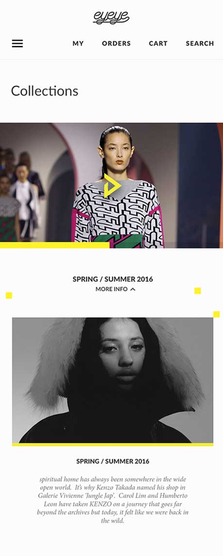- 디자이너 계한희의 Directing으로2016 S/S 시즌 론칭하는 ‘EYEYE’는 화려하면서 위트 있는 패턴과 심플한 실루엣으로 믹스 앤 매치가 돋보이는 컨템포러리 여성복 브랜드입니다.
